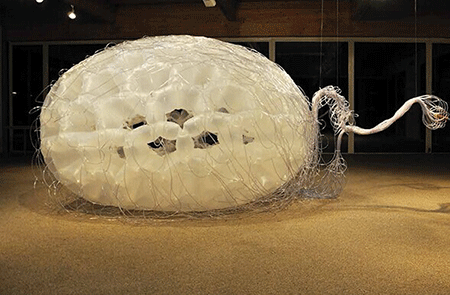 《有機拱門II》是美國藝術家奇科·麥克默蒂創作的一個特定地點的裝置,包括一系列不同大小的充氣拱門,它們每天會進行數次有機變形。拱門的造型,讓觀眾如置身于古老而神秘的古羅馬建筑之中,而充氣拱門被懸掛在屋頂上并不與地面接觸,一如近乎無重力的建筑結構懸浮和棲居在美術館的空間之中。它們透明的皮膚是經過特別設計的高強度記憶織物,在吸收日光的同時,拱門在及其細微的動作中向內彎曲,并慢慢地盤旋形成不同表情的有機體,暗示著新的生命將要到來,猶如一個活的系統即將覺醒。在建筑結構和有機生命體的過渡狀態中,在形態的呼吸吐納中,物體呈現出具象和抽象符號的交替變化,拱門的變化也受到觀眾的手勢影響,每個觀眾的隨機移動同時影響著這個有機體,從而創造一種新的物質形態的混合模式。