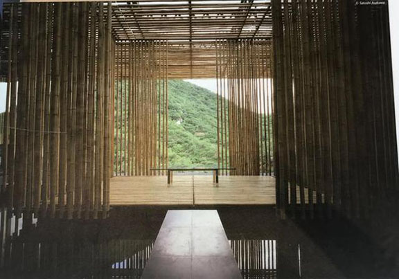 竹,10種材料之一,其代表性建筑為中國北京的竹屋。竹子具有天生長勢筆直的特點,但是它的外形依舊不少的吸引著設計師們。縱觀 20 世紀,竹子并沒有以主材形式大規模的使用在建筑中。因為竹子干燥后會開裂,難以用做建筑結構。然而,隈研吾和他的工作室一直在挑戰這個極限。為了建筑竹結構,去除了竹節、插入鋼材并注入混凝土,創作出了 CFB (混凝土填充竹)管。
