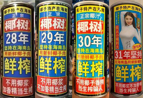 在上世紀(jì)八十年代,為了拯救瀕臨破產(chǎn)的海南罐頭廠,王光興想著只有創(chuàng)新才能有活路,他很快把目光瞄準(zhǔn)到海南的特產(chǎn)椰子上,椰子極不易運(yùn)輸,而市場(chǎng)上的椰汁很多都是香精勾兌的,王光興看來(lái)鮮榨椰子汁在椰樹(shù)資源的海南是個(gè)很好的創(chuàng)新項(xiàng)目,于是新項(xiàng)目很快落地,為了王光興又帶領(lǐng)技術(shù)團(tuán)隊(duì)歷時(shí)八個(gè)月、384次實(shí)驗(yàn)創(chuàng)新了新的油水分離技術(shù),很快不添加任何香精的椰樹(shù)牌椰汁就面世了。而椰樹(shù)經(jīng)典包裝的出現(xiàn)也是因?yàn)橐淮闻既唬邪瑯?shù)包裝設(shè)計(jì)的設(shè)計(jì)組因?yàn)橐恍┬∧Σ梁鸵瑯?shù)分道揚(yáng)鑣了,美工出身的王光興親自操刀想做一個(gè)既能把品牌的理念融入包裝又可以讓深深吸引消費(fèi)者的包裝,就這樣王光興便用word做出了沿用三十多年的硬核包裝。從包裝設(shè)計(jì)的角度來(lái)看的確是一個(gè)很土的包裝,但是從椰樹(shù)品牌發(fā)展來(lái)說(shuō),不僅耿直,堅(jiān)守,誠(chéng)信,求實(shí)的品牌文化深刻的印在了這土味包裝里,獨(dú)特的廣告深刻的印在消費(fèi)者的腦海中。三十多年的經(jīng)典包裝正是三十多年來(lái)椰樹(shù)對(duì)品質(zhì)的堅(jiān)守和幾代椰樹(shù)粉絲深深的回憶。