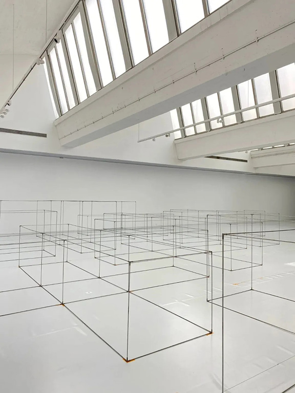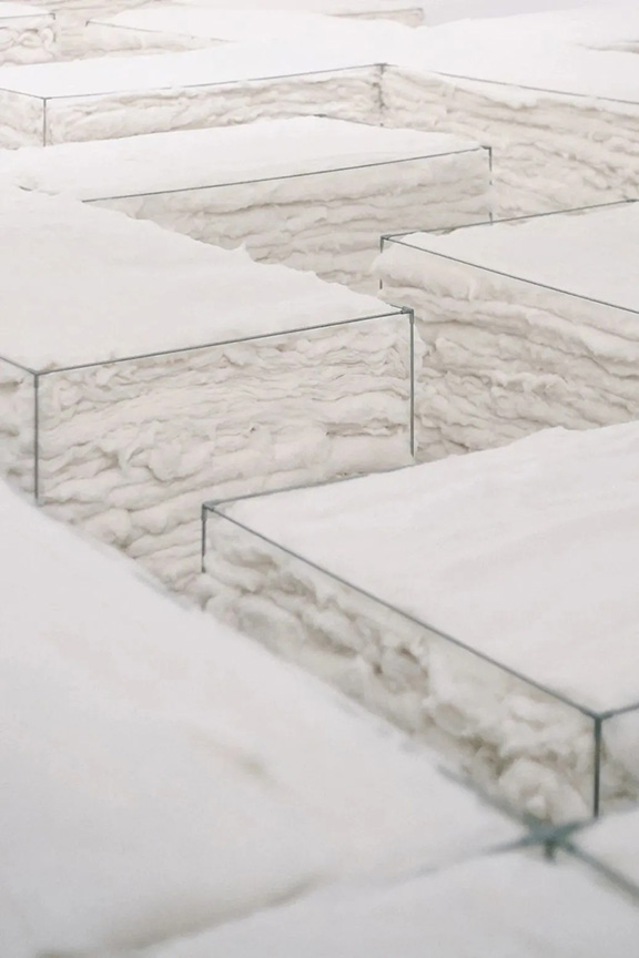 整個現場就是由棉花和鋼架搭建的巨大迷宮,棉花堆高低錯落,人穿行其中不一定能看出全貌,這也正符合“花園”之意。棉花層層疊加在一起,趙趙讓它們看起來像考古學里的土層狀態,“站在不同角度,棉花給你帶來的心態和感受力都會有所不同”。不銹鋼架是他給棉花最堅硬的結構支撐,“柔軟作為它的內核,凸顯了這種矛盾性和對立性?!?/span>