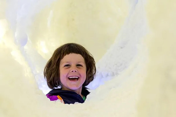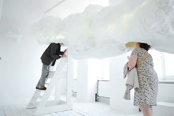 盡管我們都知道云其實是由水滴、冰晶等聚合而成的,但在藝術想象中,柔軟的棉花仍然是最接近云朵觸感的物體,你一定多多少少幻想過置身云中的感覺。日本藝術家 Matsuri Yamana 就用棉花制作過一朵巨大的云,并準備了一個梯子,讓你可以把頭伸進云朵之中,享受被云包圍的溫柔感。