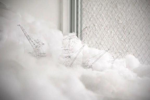 來自日本廣島的藝術家巖崎貴宏(Takahiro Iwasaki)就用棉花創作過兩件藝術品,以不同的場景,共同反映了城市變化中的一種亂序。巖崎貴宏很擅長用廢棄物做微型雕塑。在玻璃窗內,發絲被做成了電線桿和船廠的起重機,棉花和白色毛巾則組成山坡。實際上,這白色的微縮景觀就是復刻了窗外的景觀,島的形狀、船廠的位置都一樣。島上慢慢變化的風景和人們的記憶都保存在巖崎貴宏的作品中。