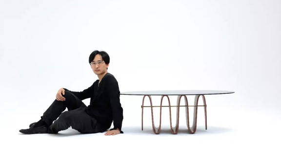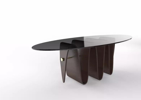"波浪茶幾“是榏鎂家具李培新設計師(RED策展人之一)設計,由上海家具協會組織抽簽,最終由上海著名品牌亞振家具進行打樣制作,制作過程極付挑戰性,需要將木皮一片一片放入模具,壓制而成。相當于用一種新的重組方式達到多層板生產之前就可以定型的工藝。這樣對多層板的浪費也是減少到最低。為了讓多層板更穩定,且有張力,他們選了銅作為固定多層板形狀的一個拉桿。