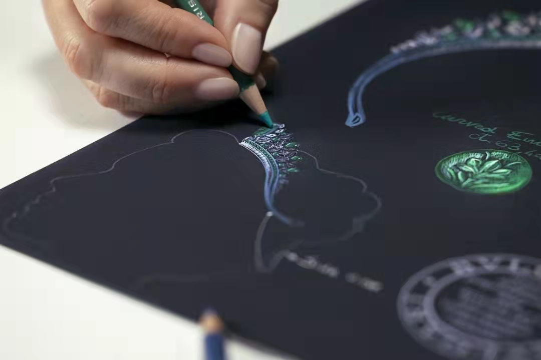 Jubilee Emerald Garden高級珠寶作品堪稱凝聚匠心工藝的典范力作,由一位金匠大師攜手一支五人的團隊耗時逾1500個小時傾力打造,其中兩名工匠專門負責手工寶石鑲嵌。該作品采用鉑金材質制成,并鑲嵌祖母綠和鉆石,呼應慶祝英國女王鉑金禧年這一主旨。這款高級珠寶從花束造型中擷取靈感,呈現新穎別致的設計風格。所鑲嵌的一顆重約63.44克拉的贊比亞祖母綠閃爍著迷人光芒,堪稱點睛之筆。祖母綠上面還雕刻有一朵盛開的蓮花,進一步襯托出這顆寶石的驚艷脫俗。