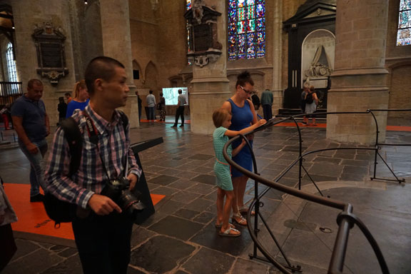 代爾夫特老教堂內有一塊弗米爾的墓碑(圖4.)。這是許多游客來代爾夫特最重要的目的地之一。墓碑底下就是弗米爾的尸骨。教堂的左側有一個小門(圖5),從這里才能進入到老教堂里面。門口有一個雕塑(圖6.),非常有特色。