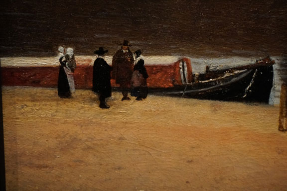 弗米爾的畫作并沒有留在代爾夫特。他的很多著名的作品如《代爾夫特風景》(圖2-2.)、《帶珍珠耳環的少女》和《小街》等藏在海牙的莫里茨皇家博物館和阿姆斯特丹的荷蘭國立博物館。《代爾夫特風景》中河岸上的人物,是用色塊疊加而成的,仿佛神來之筆,精彩異常。不到現場近距離觀察,體會不到其中的奧妙。弗米爾對色彩的運用,顯然已經揮灑自如。而且,這是兩百年后,印象主義畫家經常采用的方法。托雷重新發現了弗米爾,分析了荷蘭繪畫的主題,同時也為法國藝術中的自然主義和印象主義在他們的藝術中再現日常生活主題奠定了基礎。托雷激發了人們對荷蘭繪畫的興趣,荷蘭繪畫可能對他(托雷)生活的那個時代的藝術產生了很大影響。庫爾貝仔細地模仿了17世紀荷蘭繪畫中的場景,以此來描繪19世紀中葉法國的日常生活。甚至德加也承認他正是在對17世紀荷蘭繪畫的研究中形成了自己的繪畫風格。弗米爾等17世紀的畫家對法國印象主義和現實主義產生了如此重要的影響。