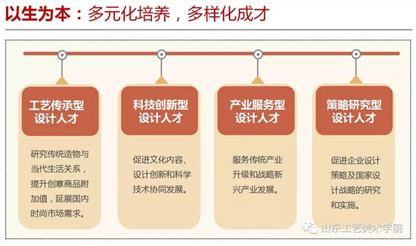 潘魯生提出,對接當前的民生需要,發展教育,培養人才,仍是基礎工程。改革開放40年,中國設計教育得到快速發展,面對當下“雙一流”建設的機遇與挑戰,如何準確定位學科未來發展方向,如何培養設計人才與民生需求對接是當下需要思考的關鍵問題。首先,設計教育同質化仍是擺在面前的首要問題,應引導綜合大學及綜合性藝術院校、理工及技術大學、藝術與設計院校、高職類設計院??茖W規劃專業布局,實現分類辦學、特色定位。其次,立足設計屬性,應該以“文化、設計、技術、消費”的系統設計教育思路作為創新基點,科學合理的構建學科評價體系。第三,正確認識藝術家與設計師的本質區別,解決“培養什么樣的設計師”的核心問題。就目前我國設計學學科發展趨勢及社會民生對設計需求的角度,培養具備“科學精神、人文素養、藝術創新、技術能力”的應用型設計人才具有很強的緊迫性。第四,立足“以生為本”的理念,按素質、能力、技能要求對設計師角色進行科學分類和準確定位,實施“創新與實踐兼容”的“因材施教設計教育”戰略,培養工藝傳承型、科技創新型、產業服務型、策略研究型設計人才,實現多元化培養,多樣化成才。第五,立足民生需求,培養在校大學生和未來的設計師有情懷、有責任、懂生活。例如,山東工藝美術學院推行的“工藝美術+”課程優化計劃,關注民族民間傳統文化融入現代設計教育的探索,在課程體系中融合中華傳統文化造物體系與造型體系,注重培養設計師的民族文化情感。