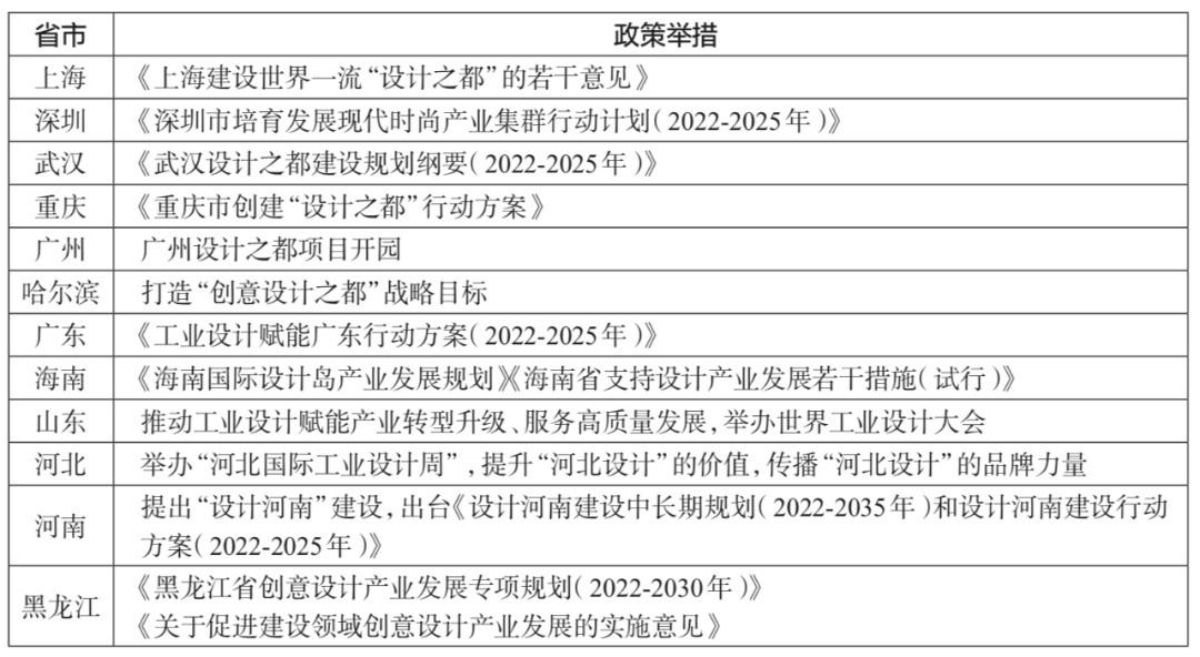 截至2022年11月,全國共計六省、六市出臺設計產業發展、設計之都建設專項政策(見表1)。其中,在城市范圍,主要聚焦“設計之都”建設,既有納入聯合國教科文組織全球“設計之都”創意城市網絡的上海、深圳、武漢等在回顧總結基礎上再出發,也有廣州、重慶、哈爾濱的創建目標與規劃。在省域范圍,東北、中部、南方省份以2022年為起點制定發展規劃,著重以工業設計賦能驅動產業發展。在各地政策規劃及行動方案中,不約而同地提出“設計產業化”和“產業設計化”理念。其中,“設計產業化”的重點,在于使設計服務成為產業,即設計類企業或組織數量達到一定規模,形成從市場需求、專業服務、質量管理到效益營收的系統化經營組織形式,成為國民經濟中以特定標準劃分的重要組成部分。“產業設計化”的重點在于建立并強化產業中設計的先導和驅動作用,即不同類別的企業加強創意、設計、研發,促進IP塑造、產品制造、運輸物流、銷售推廣、創新迭代等縱向產業鏈發展,并通過設計的集成式創新,促進資源鏈接、跨領域合作,帶動企業、行業、地域等橫向產業域、產業生態圈的整體提升。相關政策將設計作為一種集成性的機制和新型生產力發揮賦能驅動作用。因此,不論工業設計還是更廣泛的文化創意設計,不只在于通過技術創新實現產業升級,更需圍繞顧客的消費痛點,提升供給與市場需求的適配性,將消費者未被表達的訴求、文化認同及生活主張等,經由設計進行構建,用場景組合進行承接,以新產品恰如其分地表達,并通過新商業模式加以實現,推出符合新消費需求的新產品、新品牌、新體驗、新場景,創造包括產品設計、品牌設計、體驗設計、商業模式設計等在內的商業價值,使技術升級與市場升級相結合,實現從低附加值到高附加值、從高能耗高污染到低能耗低污染、從粗放型到集約型的產業升級。